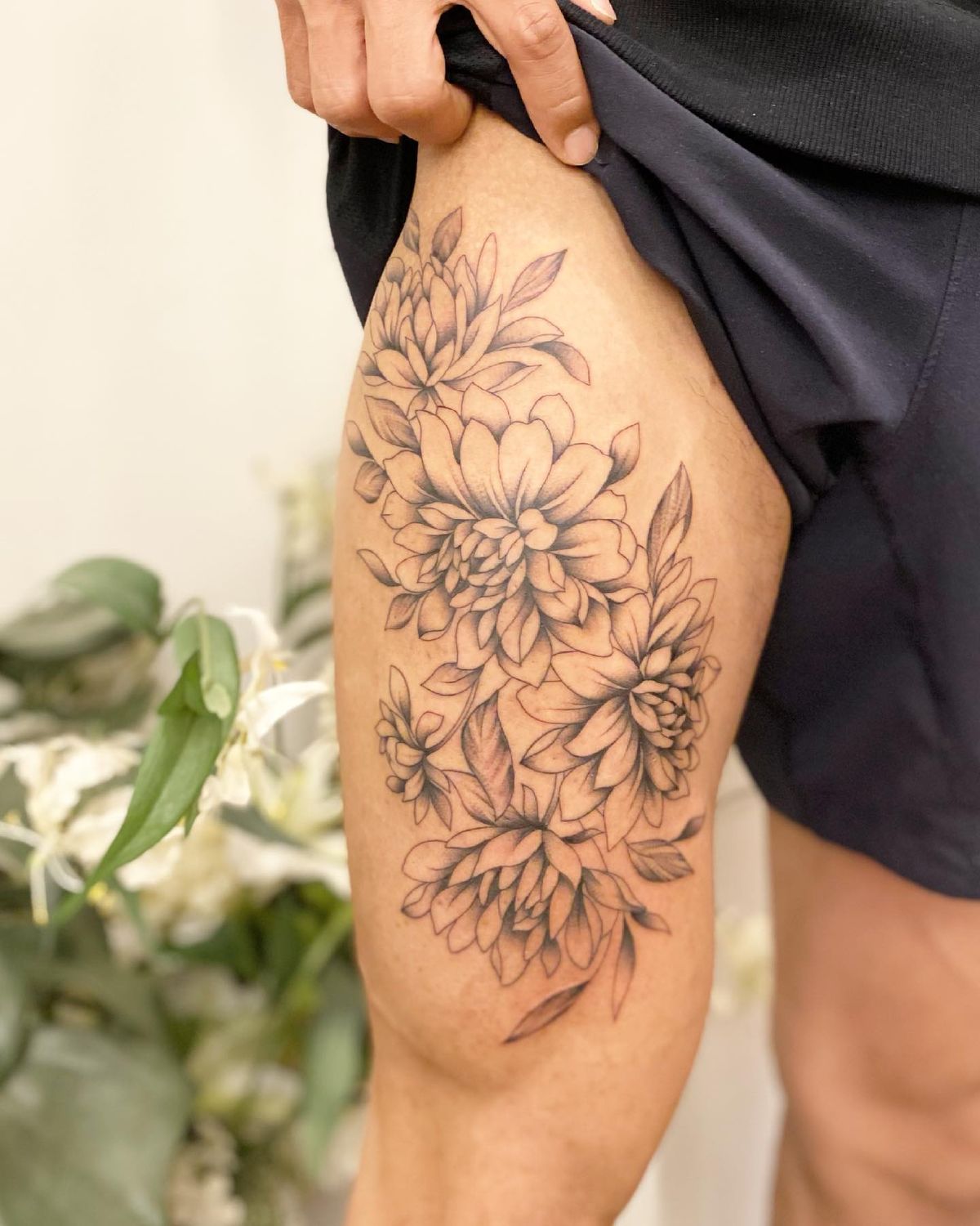 Soft, flowing, and beautifully organic, this floral thigh tattoo brings a touch of grace to masculine ink. The delicate shading and leaf patterns add a sense of calm and balance, evoking a feeling of growth and renewal. It’s a quiet yet confident piece that feels almost like nature’s whisper on the skin.