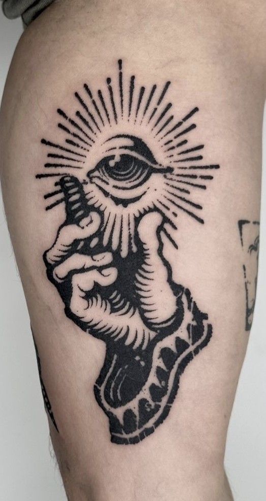This striking design of an open hand holding the all-seeing eye radiates mystery and spiritual power. Its bold blackwork style and rays of light draw instant attention, evoking old-school tattoo energy with a touch of mysticism. It’s one of those mens thigh tattoo ideas that feels both ancient and current—a perfect blend of rebellion and meaning.