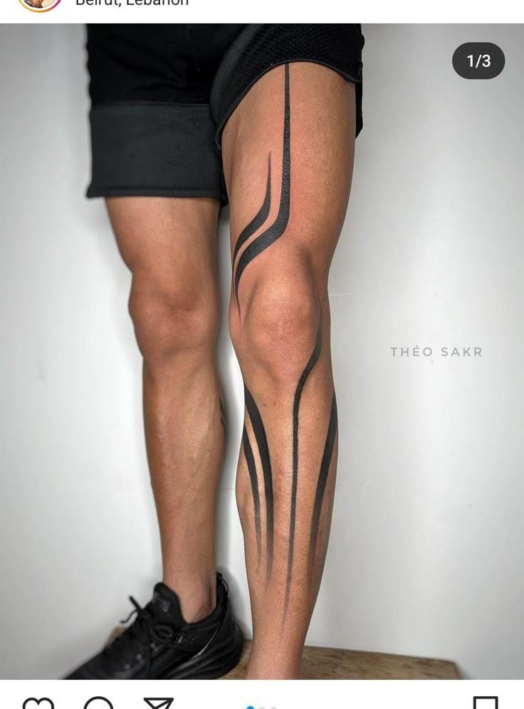 Sharp, sleek, and magnetic-thigh tattoo channeling pure modern energy. Flowing black lines carve along the leg like waves of motion, drawing the eye with every step. The kind of ink that says more with less, exuding confidence sans a single symbol or word.