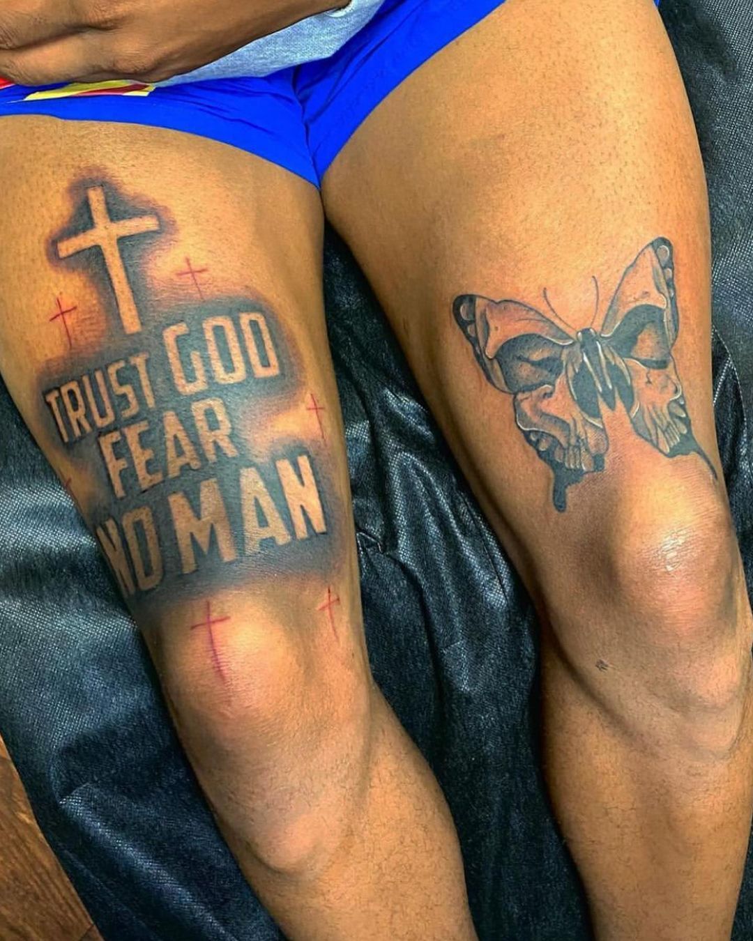 Bold and unapologetic, this thigh tattoo hits like a declaration carved in smoke and steel. The phrase “Trust God, Fear No Man” stands tall against a shadowed backdrop, giving the words a sense of depth and power—as if they’re rising through mist. The cross above anchors the message spiritually, while the subtle red marks act like sparks of energy, adding just enough contrast to make the whole piece feel alive. It radiates conviction, like a personal creed you wear for the world to see.