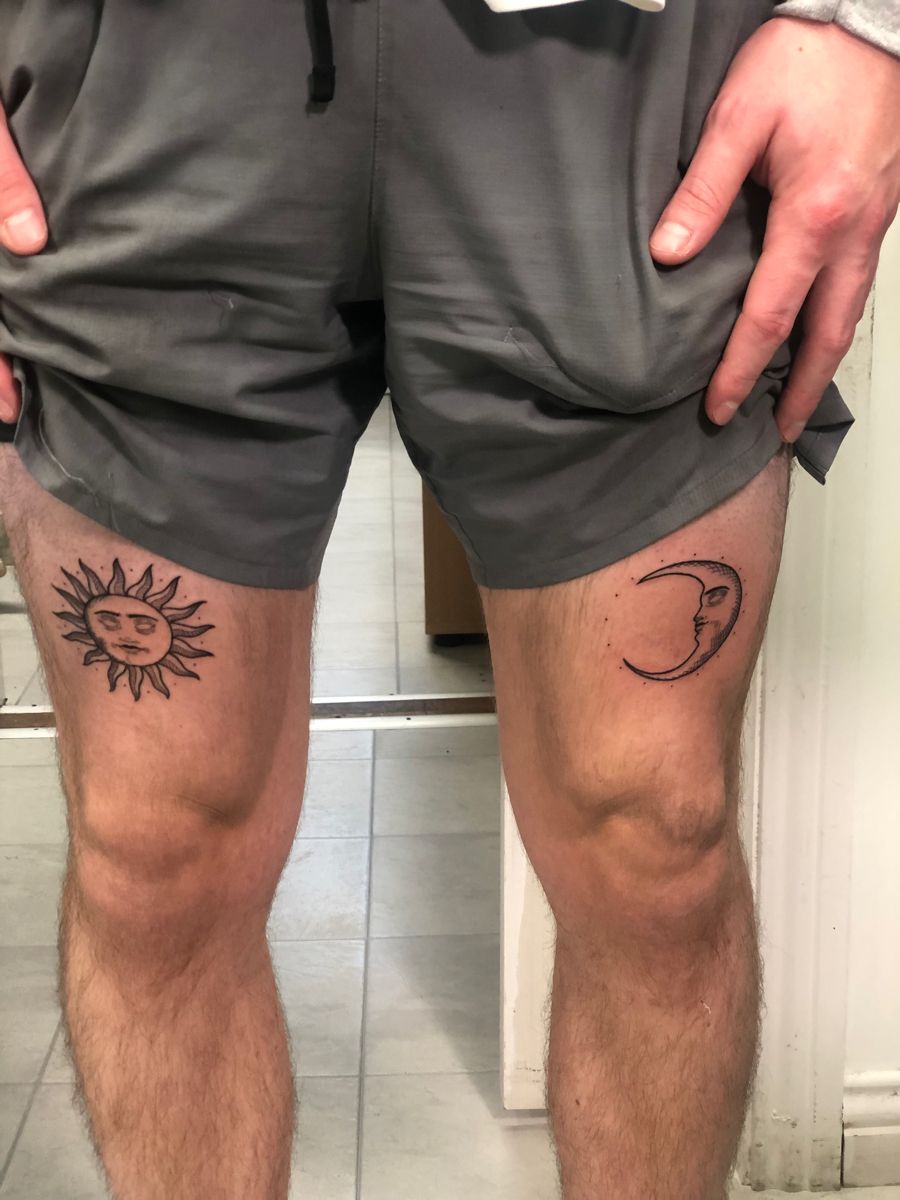 Balanced across both thighs, the expressive sun and sly crescent moon feel like day and night in dialogue. The spacing lets each symbol breathe while the duo reads as a set—simple, graphic, and instantly charming. If you love minimal patchwork but want a connected story, this pairing delivers harmony without clutter.