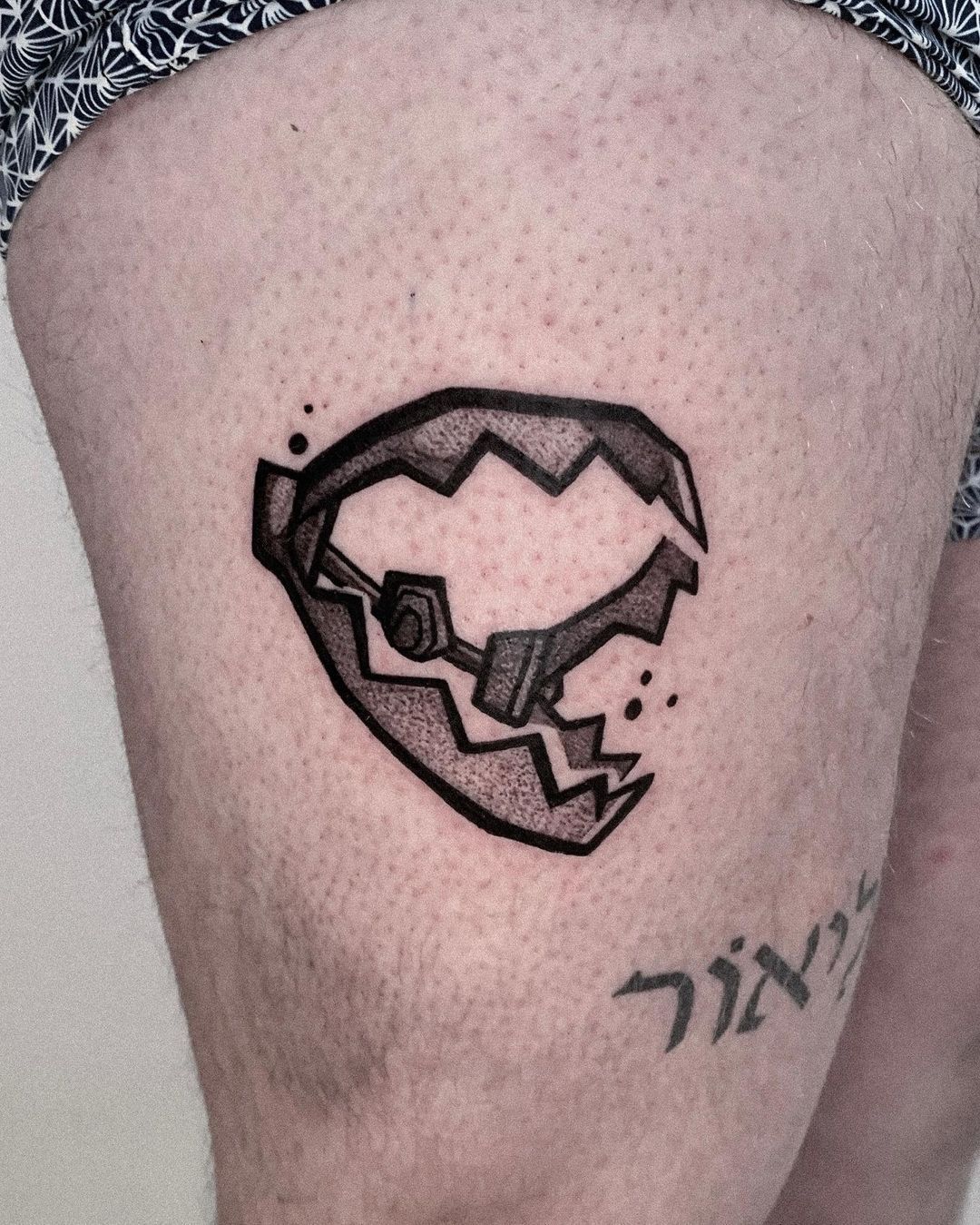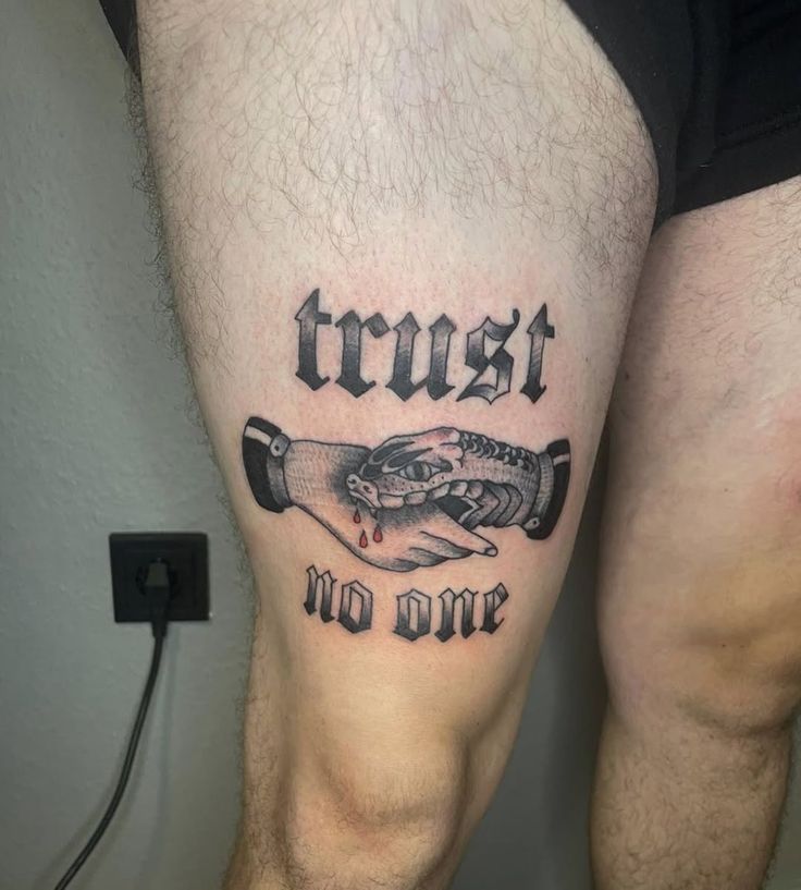 Bold blackletter and a handshake that’s more warning than welcome—this thigh piece is unapologetically blunt. The drop of red punctuates the message like an exclamation point, while the classic shading keeps the design rooted in traditional craft. It’s one of those mens thigh tattoo ideas that broadcasts boundaries and looks strong doing it.