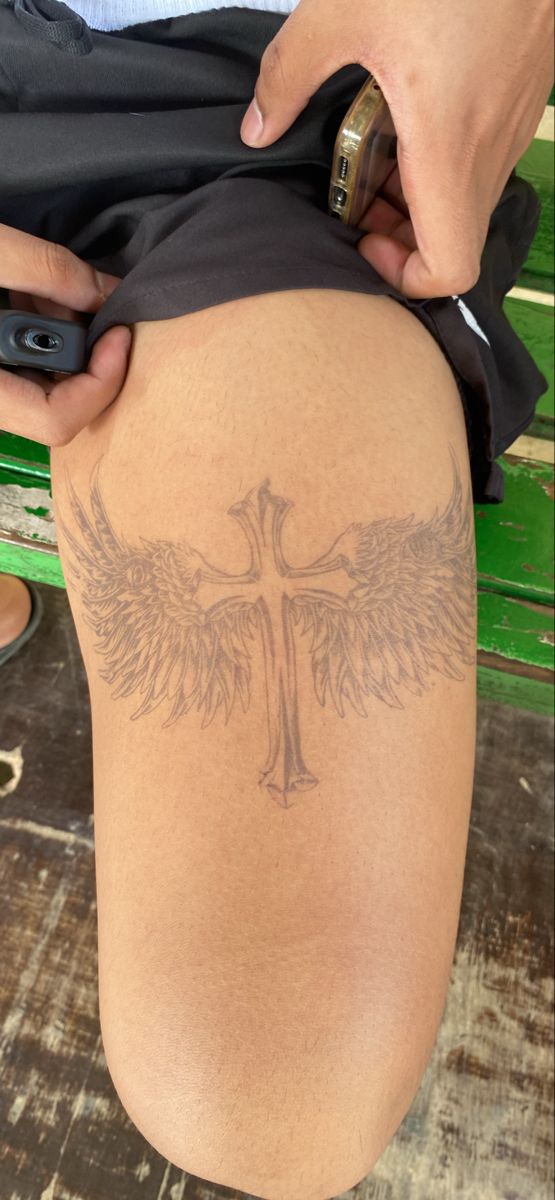 This cross flanked by sweeping wings reads like a promise you carry on the thigh—protection, grit, and a quiet faith that doesn’t need to shout. The feathering feels airy while the bone-like cross grounds it, so the whole piece balances softness and strength. There’s something undeniably Cool about the symmetry: it frames the quad like armor, catching light and shadow as you move. If you love mens thigh tattoo ideas with heart and presence, this one tells a story without a single word.