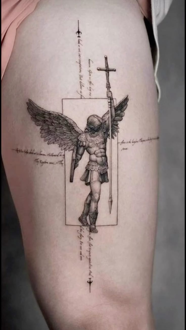 This tattoo blends illustration with handwritten-style text, giving it a deeply personal feel. The archangel stands strong within a frame, while the script adds a sense of prayer or intention. It feels like a page from a private journal turned into art.