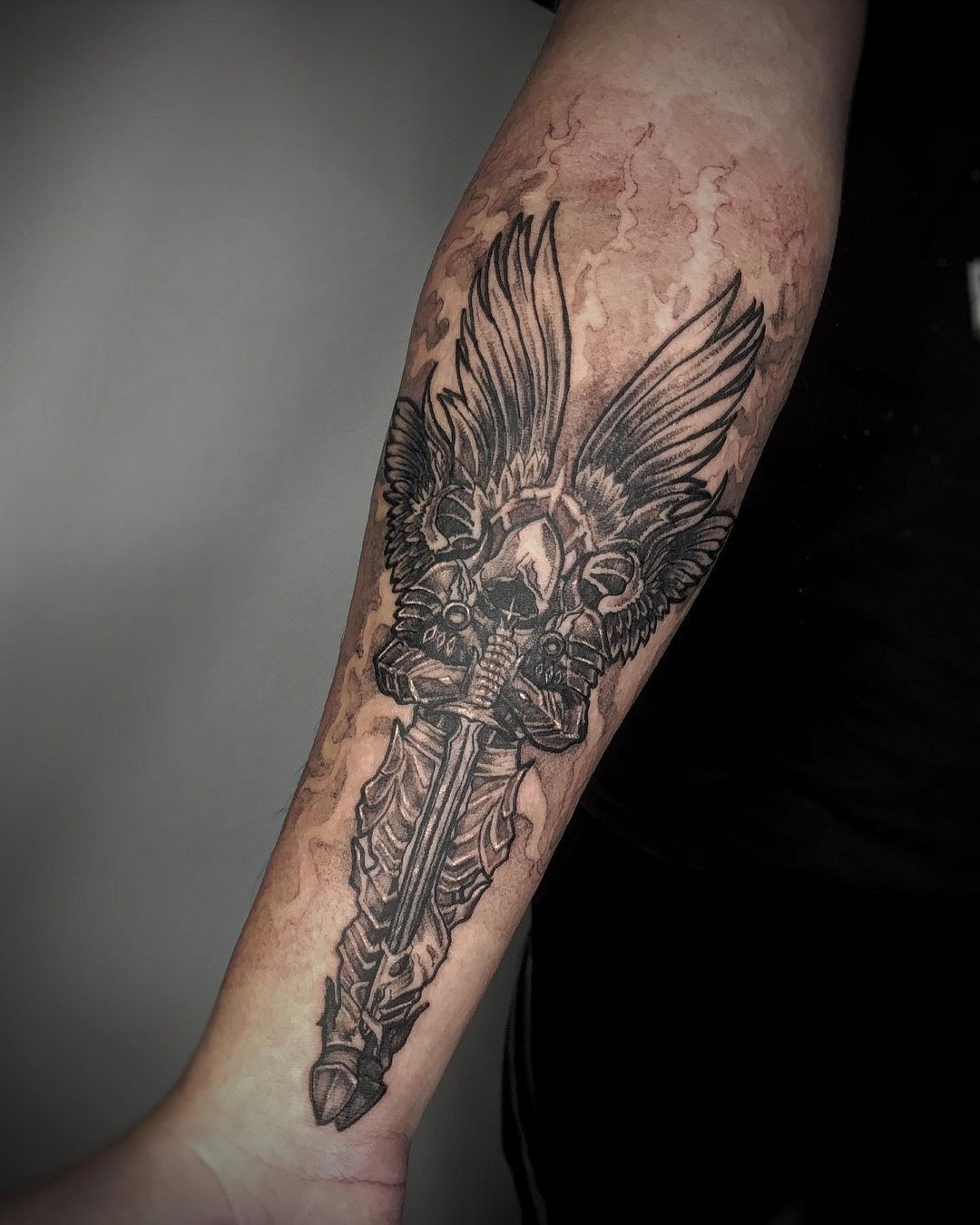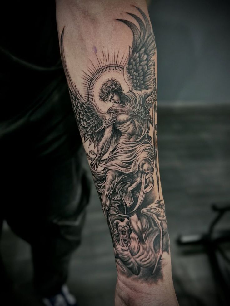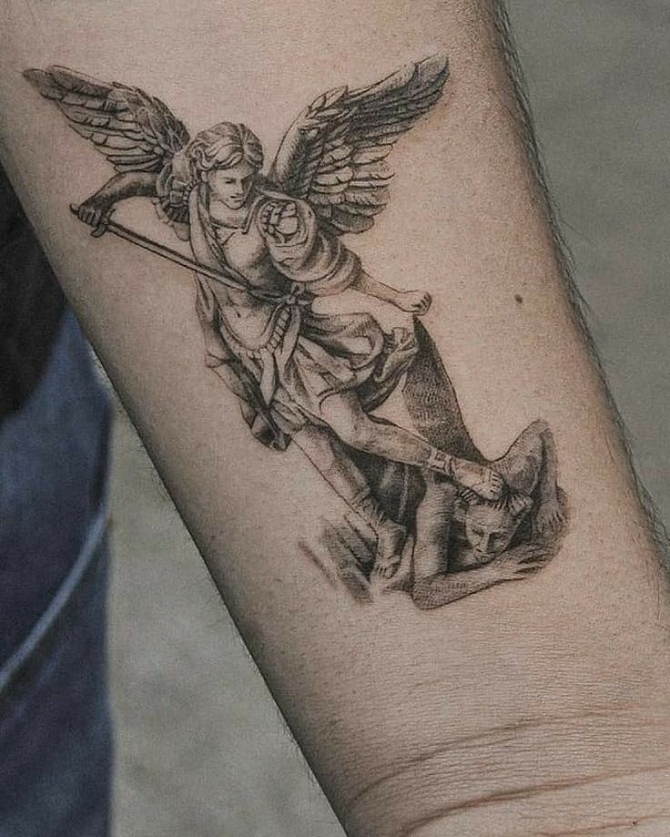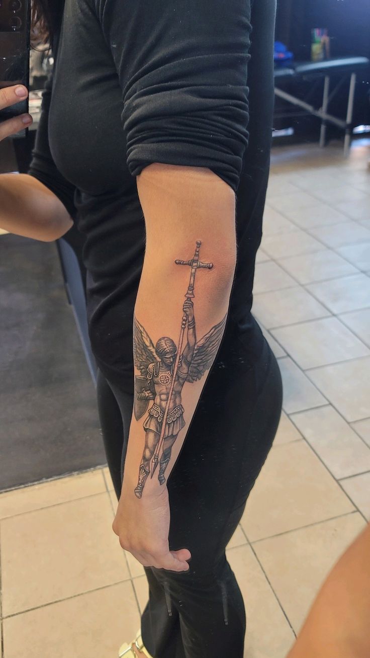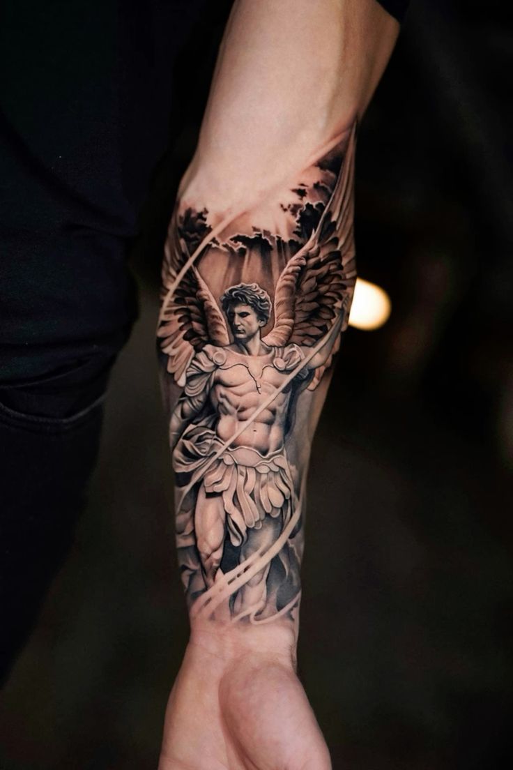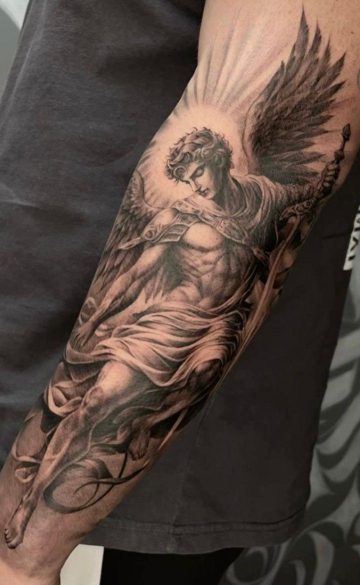 This style suits the forearm perfectly, especially for those who prefer refined ideas over bold statements. Fine shading makes it flattering on different skin tones, but it does need an artist comfortable with soft gradients. It’s a great option if you want an archangel tattoo that feels spiritual without being overwhelming.