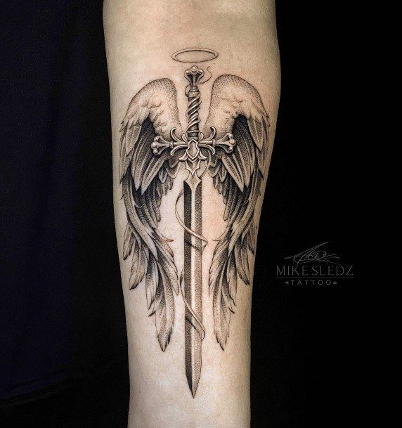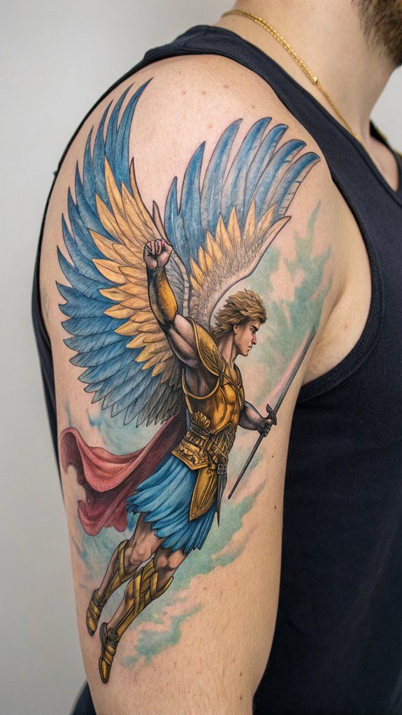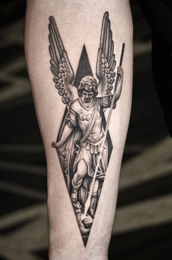 This design suits the arm or back and is ideal if you connect with archangels as guides rather than warriors. Soft shading and balanced proportions make it a timeless option, especially for those looking for ideas that age gracefully.