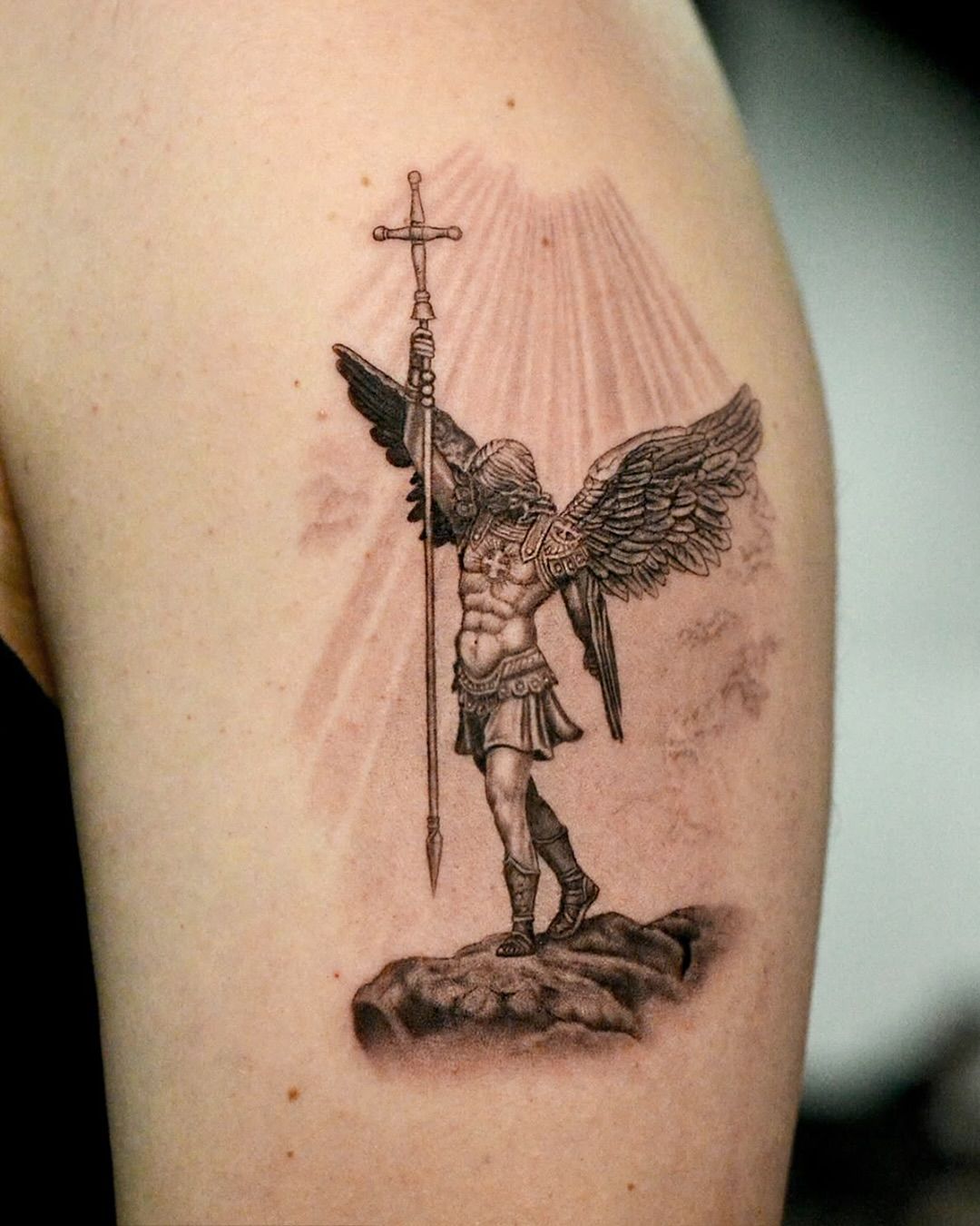 This design feels quietly powerful and surprisingly intimate. The archangel is simplified, almost restrained, with the raised cross becoming the emotional focal point. It’s a tattoo that feels personal rather than performative.