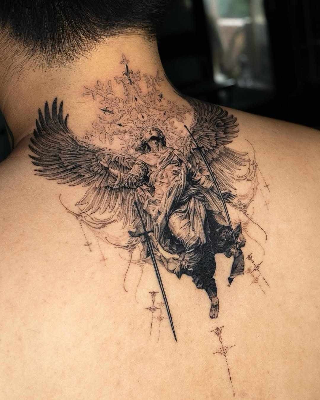 Upper back placement works beautifully here, allowing the wings to stretch naturally across the shoulders. This is a strong choice if you see archangel ideas as guidance rather than defense. Fine-line detailing combined with soft shading gives the tattoo an airy quality, but it does require careful aftercare to keep those lighter lines crisp.