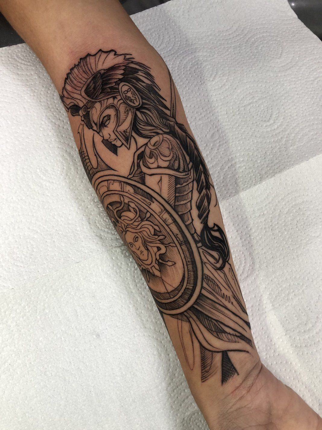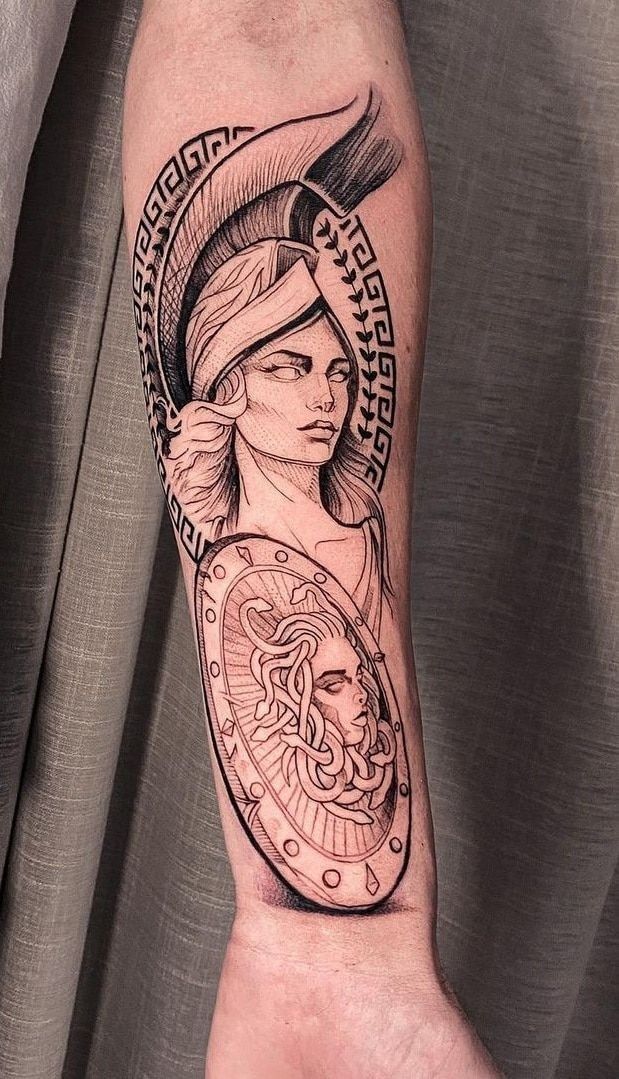 7. Athena With Medusa Shield Forearm Tattoo