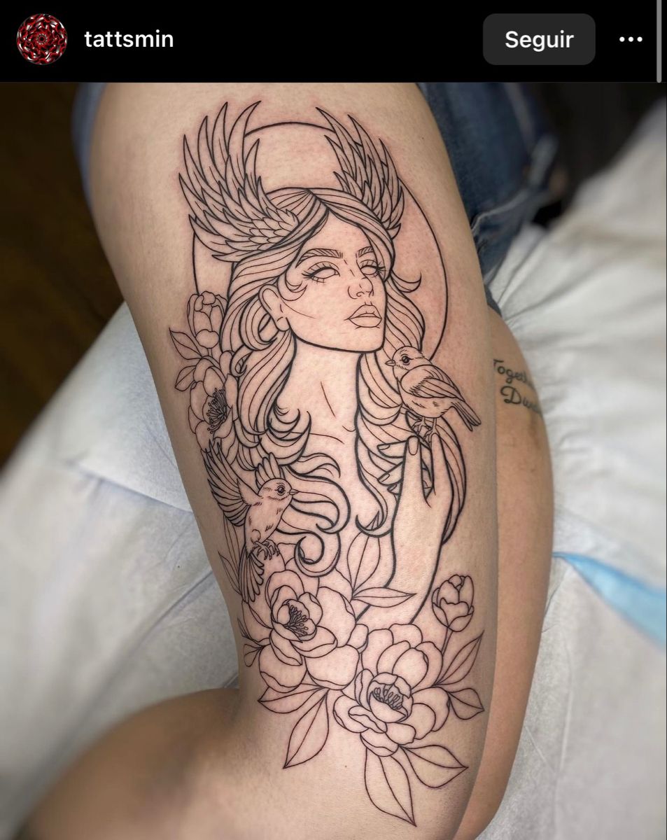 Because it’s built almost entirely from fine line work, aftercare and styling matter a lot. Keep the area moisturized and out of the sun while it heals so those crisp lines stay sharp, and later invest in a good SPF if your thigh sees a lot of daylight. This style suits smoother skin and works beautifully on curvier thighs, since the long stems and curls of hair follow your natural shape. If you ever want to add color, the flowers offer an easy place to introduce soft tones without changing the whole design.