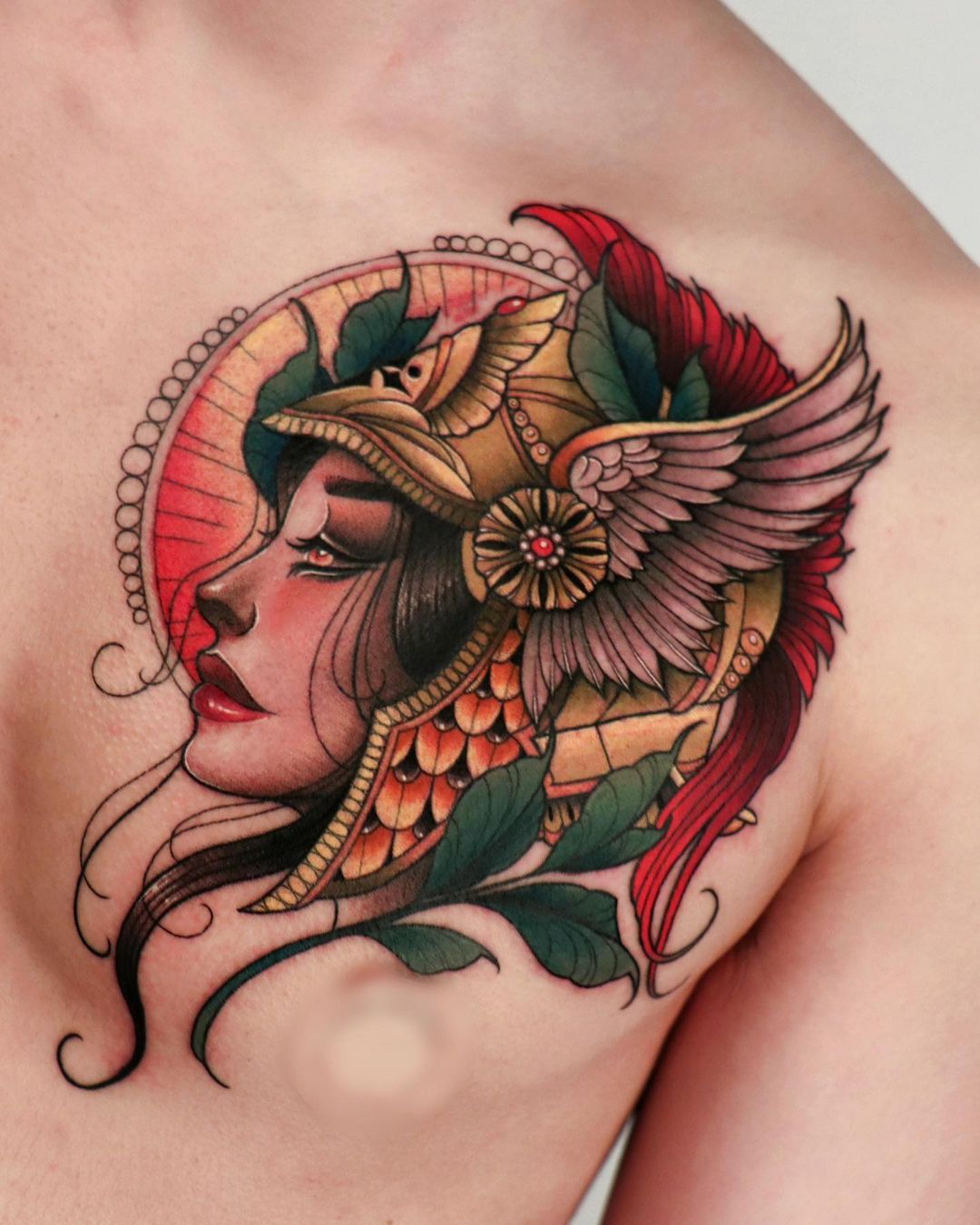 This luminous chest tattoo looks like a jewelry cameo brought to life: Athena in a gleaming golden helm, framed by leaves and feathers, against a warm red sun. The rich greens and golds give it a regal, almost royal portrait feel, while the soft shading in her face keeps it sensual and very human. It’s a beautiful example of how Athena tattoo ideas can be both fierce and glamorous, especially if you’re drawn to Greek mythology but want a little old-Hollywood drama in the mix.
