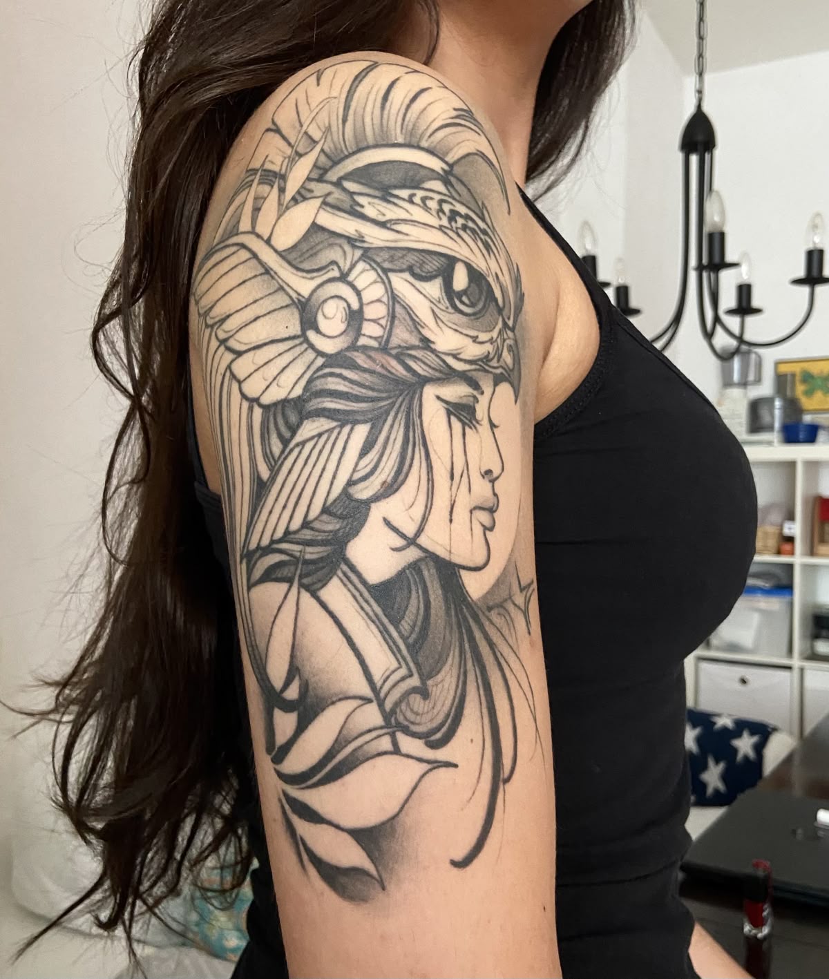 This design is ideal for men and for women who love big, statement ink and don’t mind a little attention at the pool or beach. The broad shape hugs the natural curves of the chest and shoulder, so it flatters fuller upper bodies especially well. Talk to your artist about building this into a future Goddess sleeve by extending the feathers, plumes, or armor onto the bicep and upper arm if you think you might want more mythology later on.