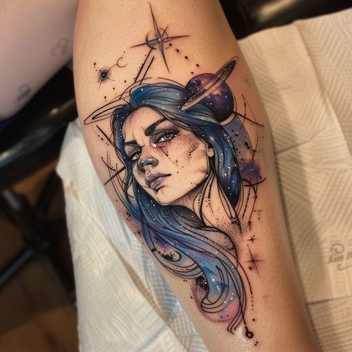 In 2025, celestial tattoos are still very much having a moment, and this design taps straight into that trend while keeping your tattoo original. Ask your artist for saturated color and gentle dotwork stars so the galaxy effect doesn’t blur over time. This look suits calves and outer forearms on both men and women, especially if you like designs that peek out from under shorts or rolled sleeves and catch the light with every step.