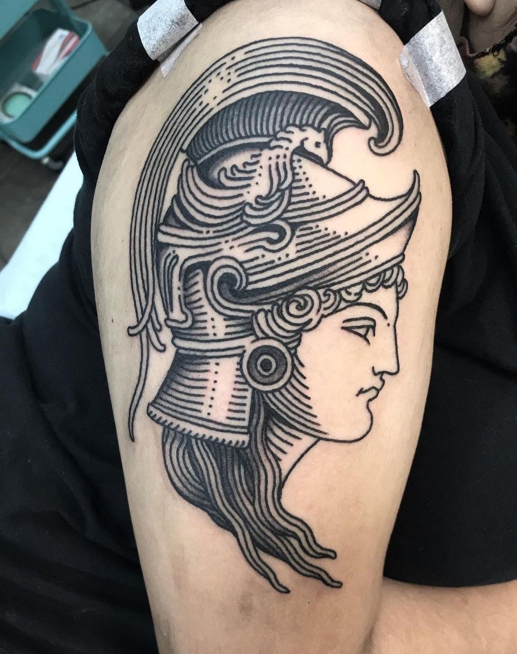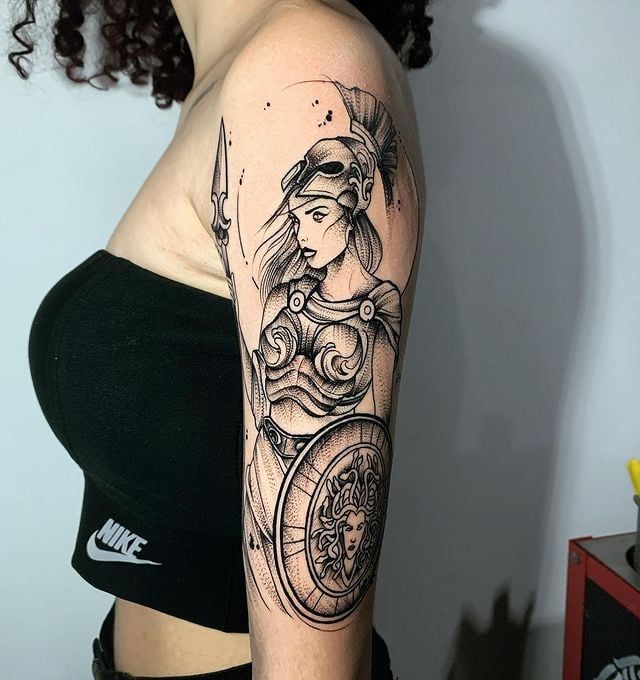 21. Haloed Warrior Athena Upper-Arm Tattoo