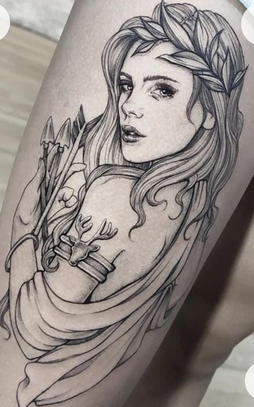 This bold black and grey archer design channels the strategic side of a warrior goddess, bow drawn and arrows ready. The sweeping lines and dramatic shadows make the whole piece feel like it’s in motion, as if she’s about to release her shot at any second. It’s a powerful option for anyone who sees their own strength in focus and precision rather than brute force, and it fits right in with Greek mythology-inspired work even if you never name the goddess out loud.