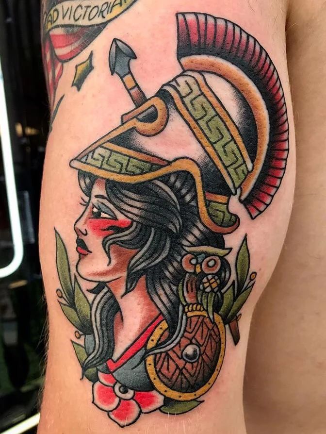 This bold traditional piece gives you everything you’d expect from Greek mythology in one glance: the plumed helmet, the shield, and of course the owl of wisdom perched beside her. The bright reds, greens, and golds bring a classic tattoo shop energy, like a vintage flash sheet inspired by Greek mythology. It feels heroic but still approachable, more “I’ve got your back” than “I’m going into battle.” If you like your Athena tattoo ideas loud, proud, and a little nostalgic, this style is a keeper.