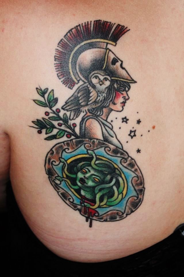 If you like your mythology with a wink rather than a scowl, this colorful piece is perfect. Athena stands in profile with her helmet and tiny owl companion, while a bright little Medusa portrait glows inside the shield. The style leans toward traditional, with thick outlines and cheerful colors that make it feel almost storybook. Placed high on the shoulder blade, it’s one of those Athena back tattoos that feels fun and personal rather than overly serious, like a private inside joke with Greek mythology.