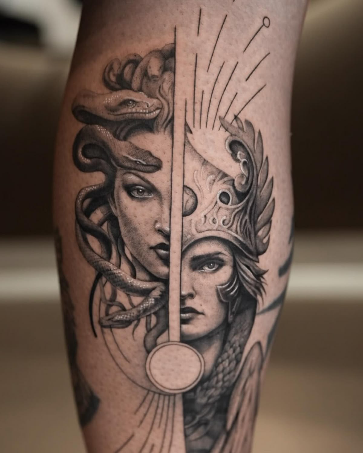 Because the composition is so vertical and graphic, it pairs beautifully with sleek outfits and jewelry that echo that same duality—think one bold ring, one delicate bracelet, or mixing hard leather with silky fabrics. If you like tattoos that become part of your overall style, this one gives you endless room to play with your “Medusa and Athena” mood when you get dressed, without needing any extra ink or accessories to explain it.