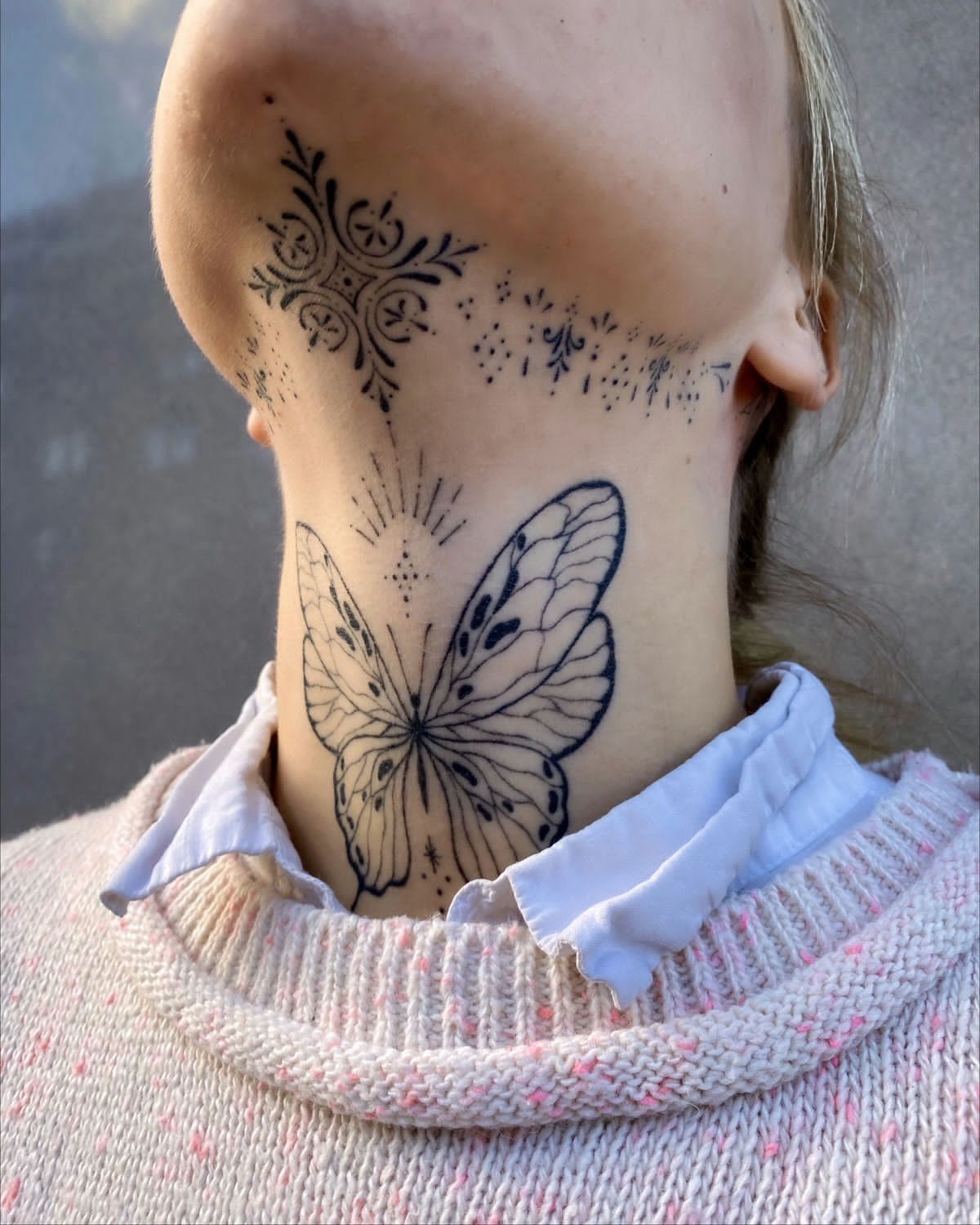 There’s a delicate magic to this tattoo. The Butterfly resting at the base of the throat feels light and symbolic, while the ornamental pattern above it adds a touch of mysticism. Together they create a design that feels spiritual, almost like a personal emblem hidden in plain sight.