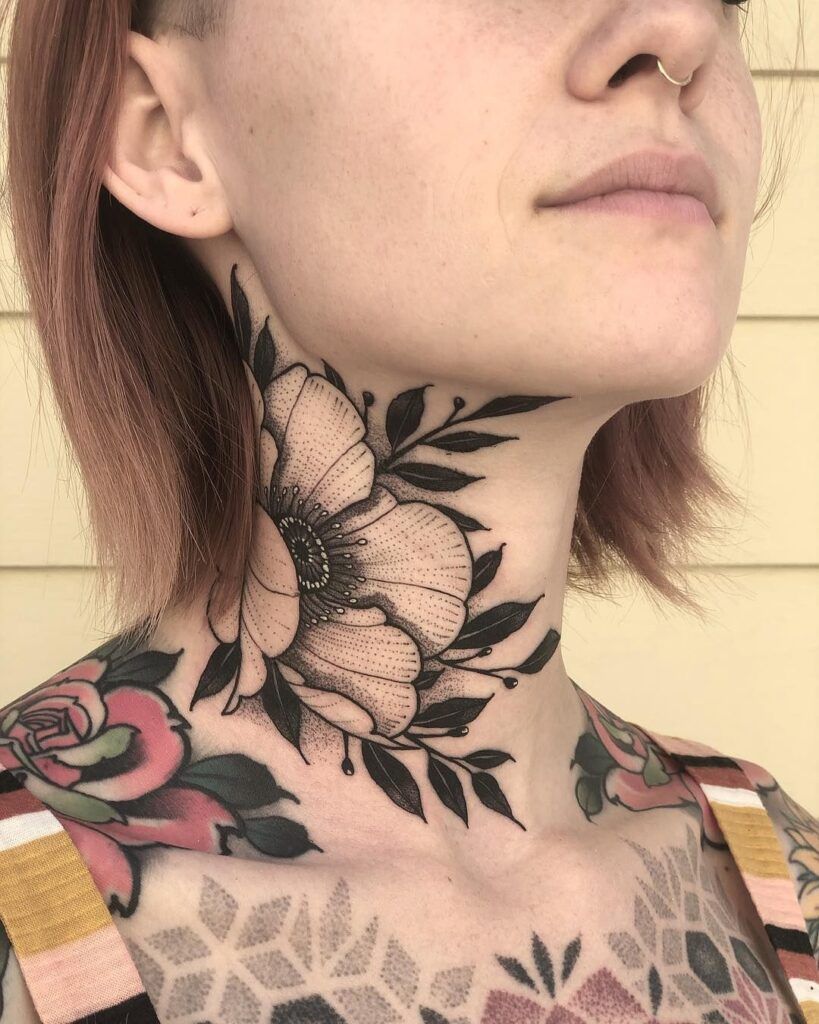 4. Large Floral Women Flower Throat Tattoo