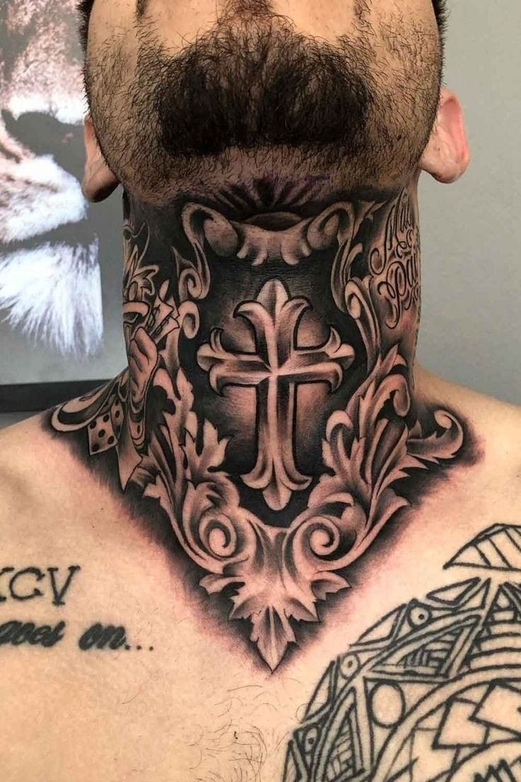3. Dark Ornamental Cross Throat Tattoo