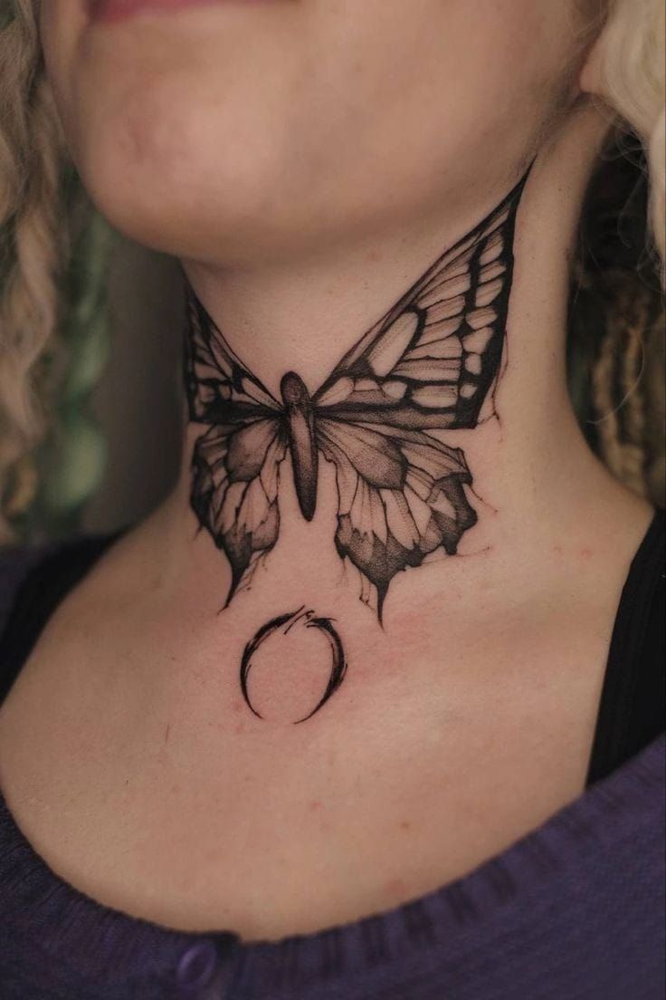 5. Butterfly and Crescent Moon Throat Tattoo