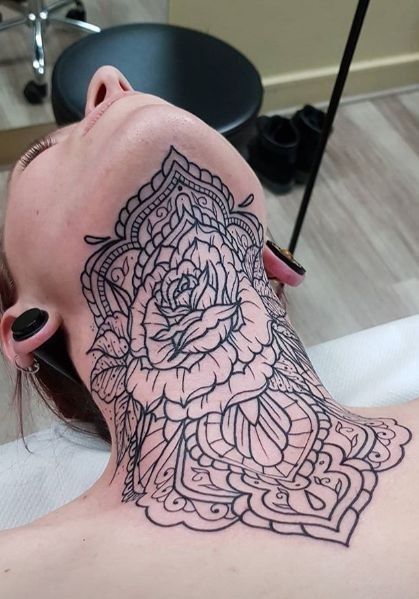 17. Ornamental Mandala Flower Throat Tattoo