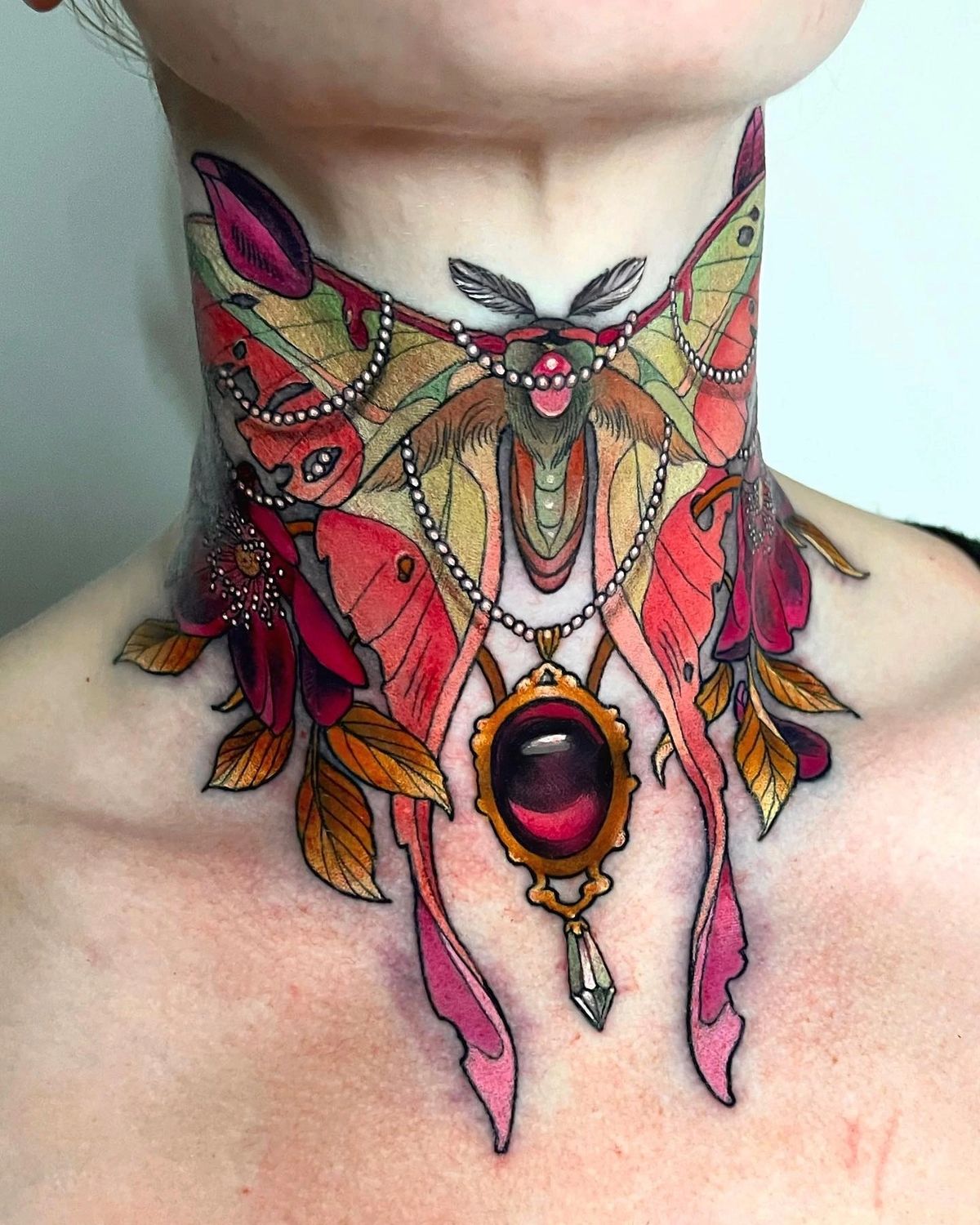 If tattoos could sparkle, this one absolutely would. The vibrant Moth spreads across the throat like a piece of jewelry, with delicate leaves, dangling chains, and a gemstone centerpiece that feels almost vintage. It’s rich, colorful, and artistic—the kind of tattoo that feels more like a necklace permanently painted onto the skin.