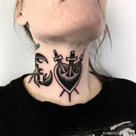 This tattoo has that unmistakable old-school edge. The bold heart pierced by two daggers feels dramatic, emotional, and unapologetically strong. It’s the kind of throat tattoo that instantly tells a story—love, heartbreak, resilience, or maybe all three at once.
