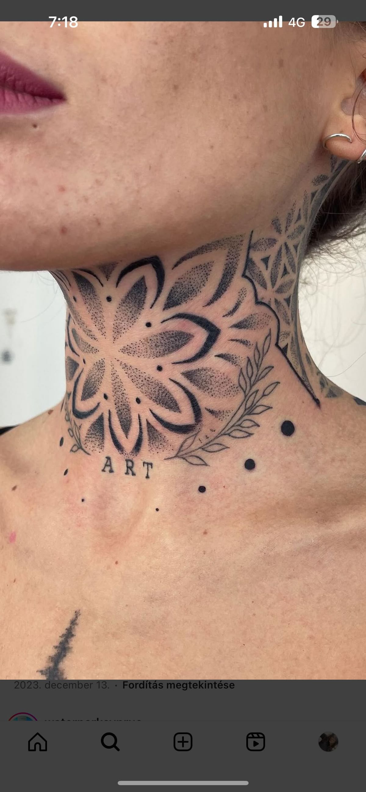 This throat tattoo feels almost architectural in the way its geometric layers expand outward from the neck. The mandala-inspired shapes and dot shading create a mesmerizing pattern that draws the eye immediately. It’s bold but incredibly clean—a design that feels precise, modern, and quietly powerful.