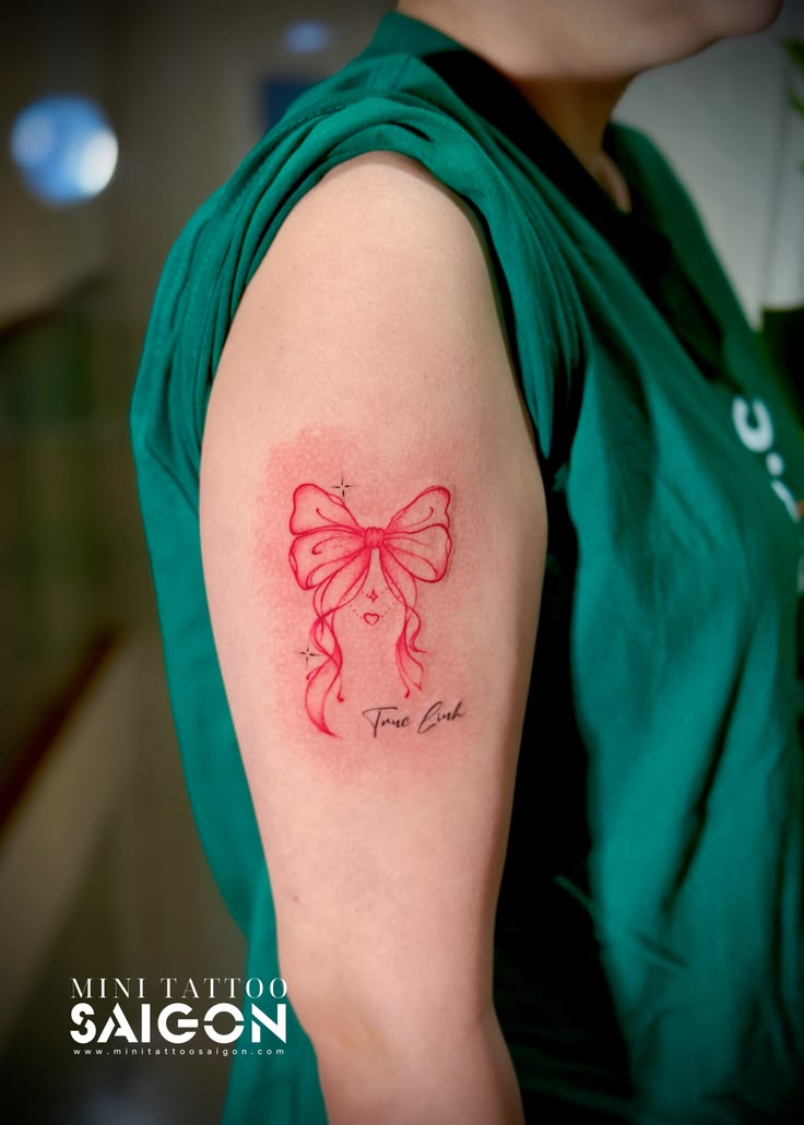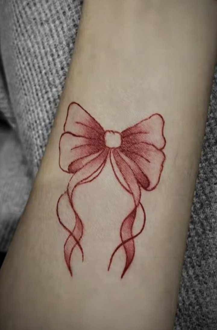 If you want something feminine but not too traditional, red ink is a beautiful way to make a simple bow feel fresh. It works especially well on the arm because the color stands out without needing a large size. The vibe is soft, romantic, and just a little playful, making it ideal for women who love subtle statement pieces. Pair it with delicate bracelets or a sleeveless top, and the tattoo becomes part of the whole look rather than just a separate detail.