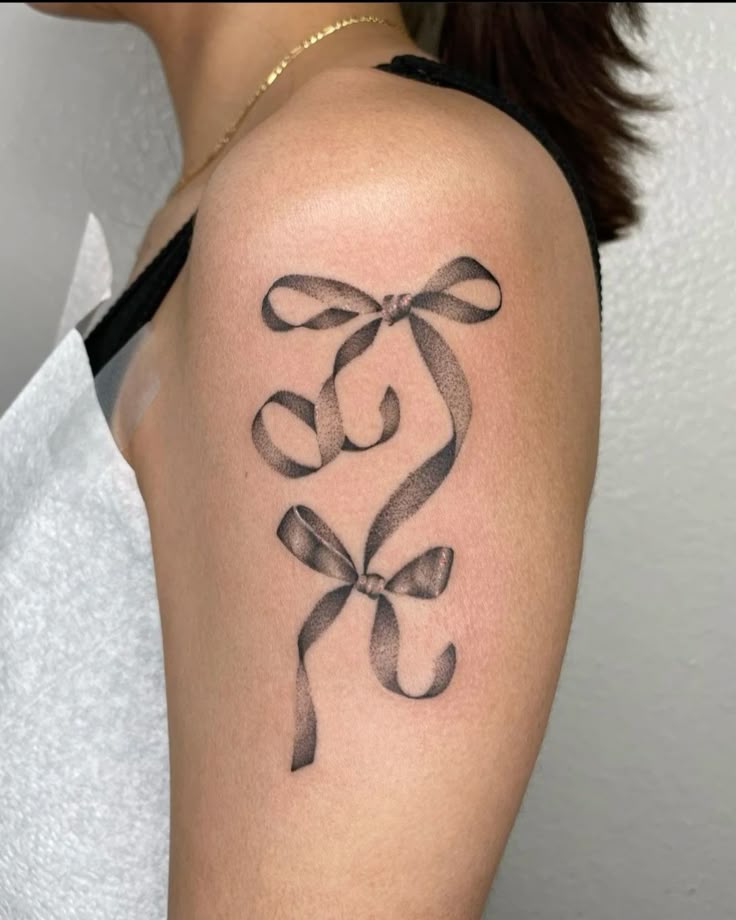 This shoulder tattoo has a sleek, almost couture feeling. The bow is not overly sweet; instead, it stretches into long ribbon-like curves that follow the shoulder in a very elegant way. The soft Black shading gives the piece a smoky, satin texture, and the extended line makes it feel more like body art than a small symbol. It is graceful, modern, and quietly seductive.