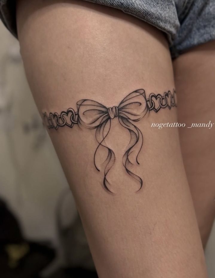 This bow tattoo has that slightly daring, lingerie-inspired charm that feels feminine without being too sweet. The central Ribbon sits like a delicate secret, while the chain-like hearts around it add a flirty, almost jewelry-like mood. It is one of those bow tattoo ideas that feels playful at first glance, but the longer you look, the more polished and intentional it becomes. The soft shading keeps the bow airy, while the wraparound effect makes the whole piece feel designed for movement.