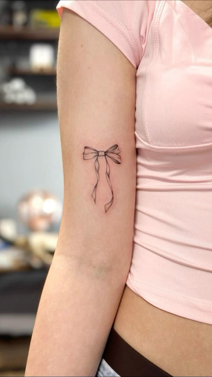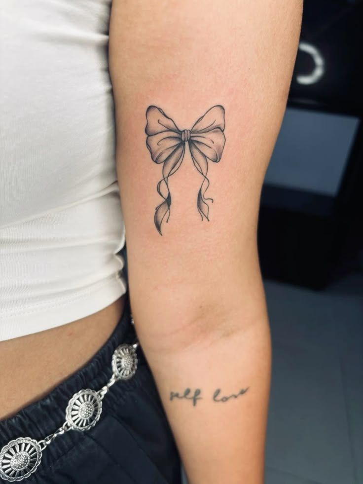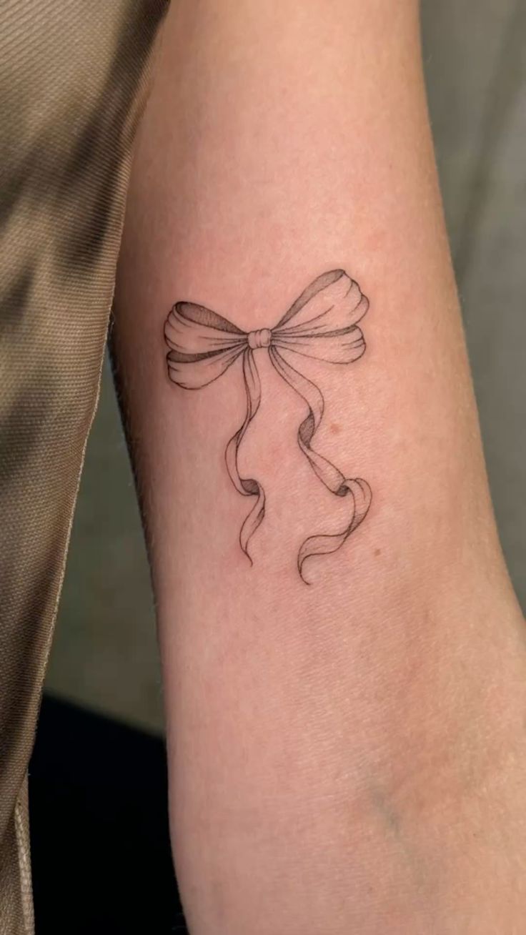 The arm is a flattering placement for this kind of Fine line design because the vertical ribbon tails naturally lengthen the area. It is also a smart choice if you want something visible but still soft enough for everyday style. Ask your artist to keep the center knot crisp, since that little detail gives the whole bow its structure. This is especially pretty with sleeveless tops, fine bracelets, and simple manicures. If you want a tattoo that feels Dainty, feminine, and low-fuss, this one is a beautiful direction.