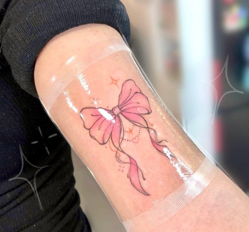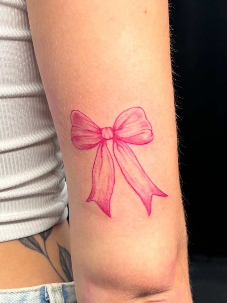 The arm is a smart placement for this style because it lets the color breathe and gives the bow enough room to stay readable. Pink ink can heal differently depending on skin tone, so it is worth talking with your artist about saturation and long-term visibility. This tattoo looks gorgeous with gold jewelry, soft knit tops, or a clean white tank. It is not trying too hard, and that is exactly the appeal: Simple, pretty, and quietly stylish.