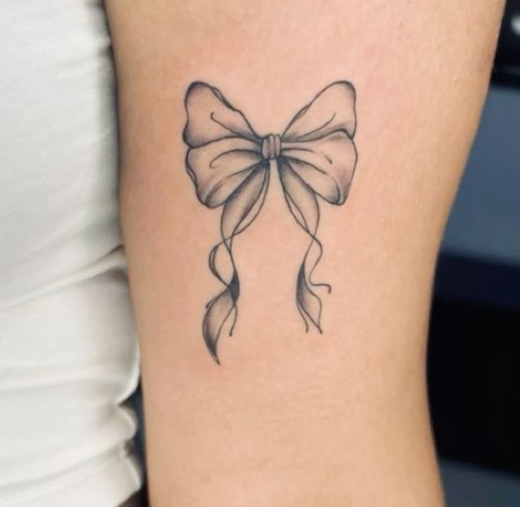 This bow has a lovely “quiet luxury” feeling, the kind of tattoo that does not need color or heavy detail to feel special. The slim loops and long falling tails make it look like a soft ribbon tied with a careful hand, while the gentle shading gives it just enough depth to feel graceful. It is feminine, but not sugary; romantic, but still clean and wearable. For women who like bow tattoo ideas that feel polished and subtle, this design has that easy charm of a favorite delicate necklace or a pale pink blouse.