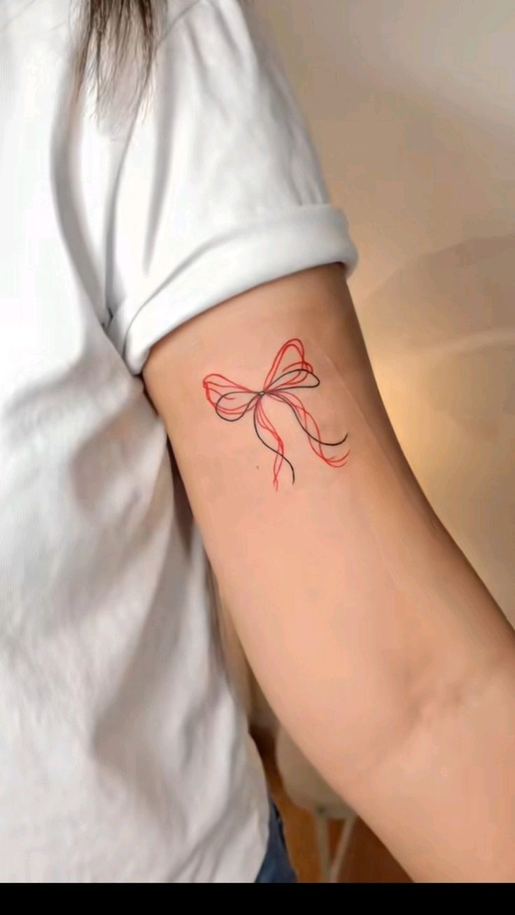This is a great option for women who like Simple tattoos with a creative twist. The arm placement gives the lines room to breathe, which matters because overlapping red and black details can become visually crowded if the tattoo is too small. A style like this works beautifully when the artist keeps the lines thin and intentional rather than perfectly symmetrical. It has a modern 2026 feel, especially for anyone drawn to coquette details but wanting something less predictable than a standard Pink bow.