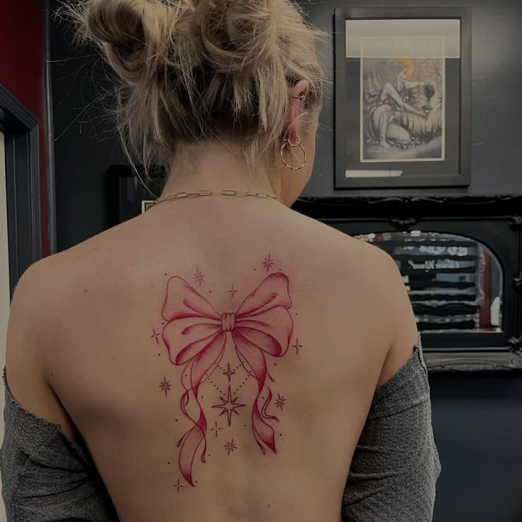 23. Romantic Upper Back Bow Tattoo