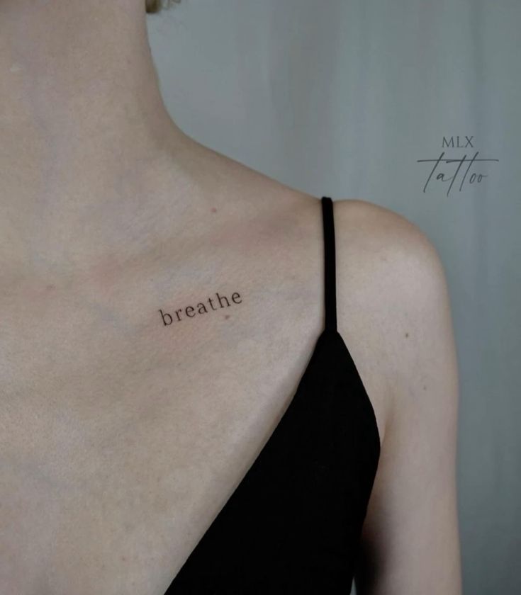 There’s something incredibly intimate about a breath tattoo near the collarbone. It feels vulnerable in the best way, like an open invitation to slow down. The placement follows the natural line of the body, making the word feel almost weightless, as if it’s floating rather than sitting on the skin.