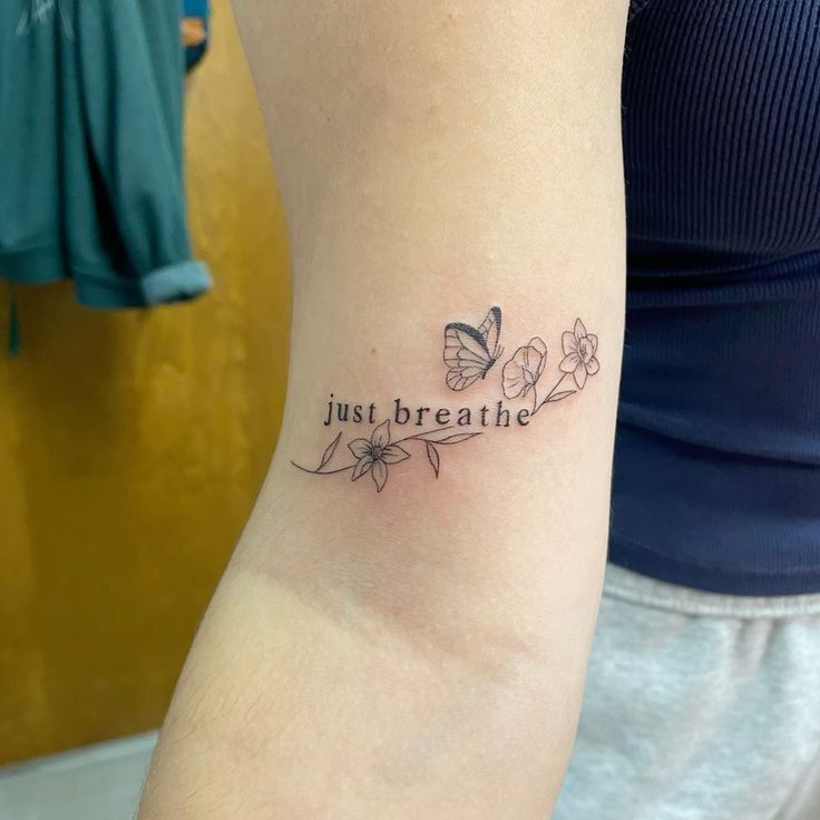 7. Just Breathe Tattoo with Butterfly and Flowers