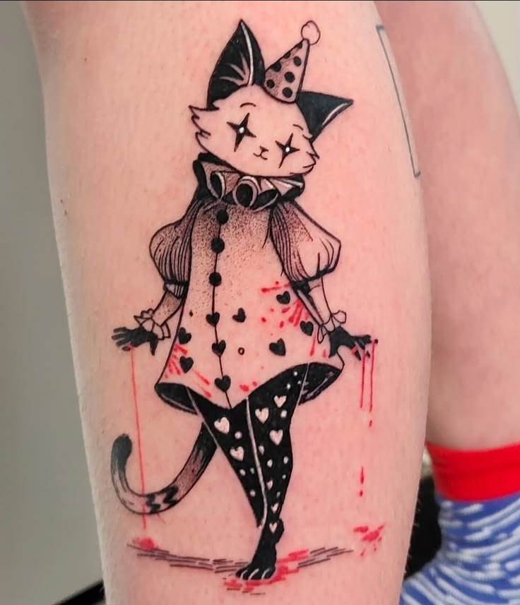 This little Cat clown is creepy in the most charming way. The pointed ears, tiny party hat, puffed sleeves, and dangling red accents make it feel like a doll that wandered out of a toy box and developed an attitude. It is cute, yes, but there is also something sharply unsettling in the stiff pose and blank little face. That balance is what makes it so fun. It feels playful, dark, fashiony, and a touch feral, which is honestly a fantastic combo for anyone who likes their tattoos with equal parts sweetness and bite.