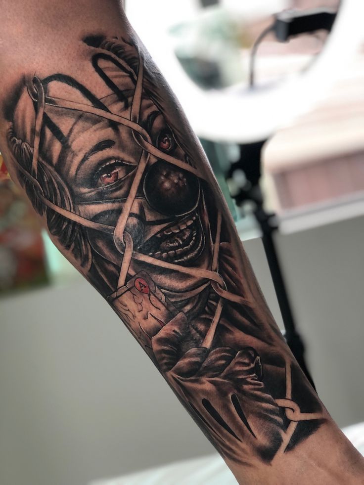 This kind of high-detail design is best for someone ready to commit to a larger piece, especially a lower arm or full sleeve concept where the shading and facial texture can really open up. It suits men naturally, but it can look incredible for women who prefer bold black-and-grey realism over delicate tattoos. Because it has strong horror imagery and layered depth, it works best as a focal tattoo rather than filler. Give it space, choose an artist who specializes in realism, and let it dominate.
