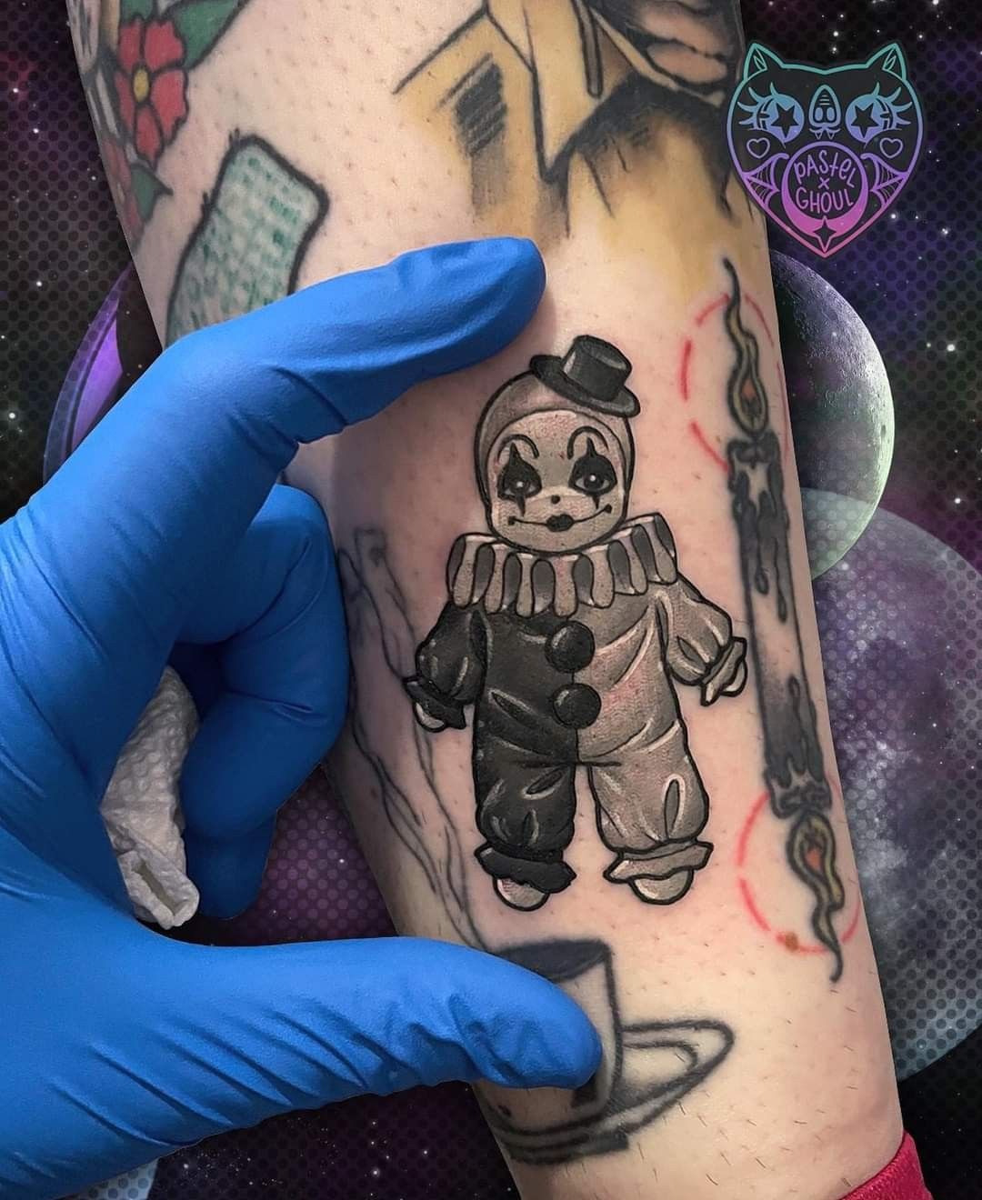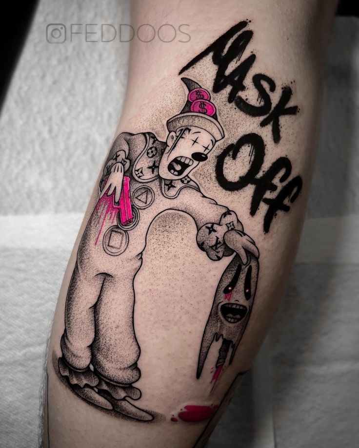 Honestly, this is great inspiration if you want to try a clown tattoo now because it proves the theme does not have to look traditional, cute, or horror-movie obvious. You can go graphic, urban, and slightly surreal instead. It works beautifully on the calf or thigh where the figure has room to stretch, and it is especially strong for people building collections with graffiti lettering, toy imagery, or modern flash influences. The pink pops also make it feel fresh rather than heavy.