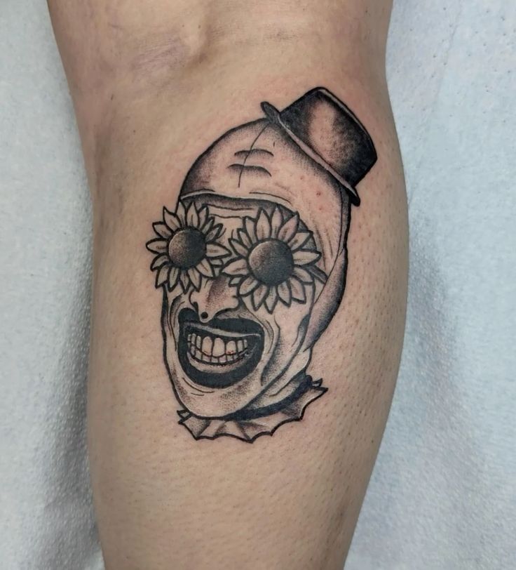 There is something deliciously strange about this one. The grin is exaggerated, the face is unsettling, and then those sunflower eyes come in and completely shift the mood into something more surreal and artistic. It feels like a clown face filtered through a daydream that went a little wrong. That mix of humor and discomfort makes the tattoo incredibly memorable. It is not trying to be polished or pretty, and that is exactly why it lands. Among darker clown tattoo ideas, this one feels refreshingly offbeat and full of personality.