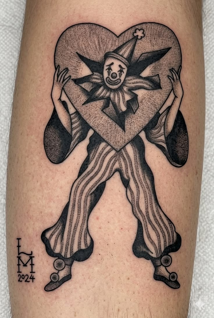 This piece feels theatrical in the prettiest possible way. The long striped trousers, tiny clown face, wide shoes, and giant heart framing the body create a silhouette that is both romantic and slightly odd, which is honestly a lovely combination. It reads like a little stage performance frozen in ink. There is sweetness here, but also a touch of loneliness, which keeps it from becoming too precious. If you like clown tattoo ideas that feel more symbolic than literal, this design has a beautiful storybook quality to it.