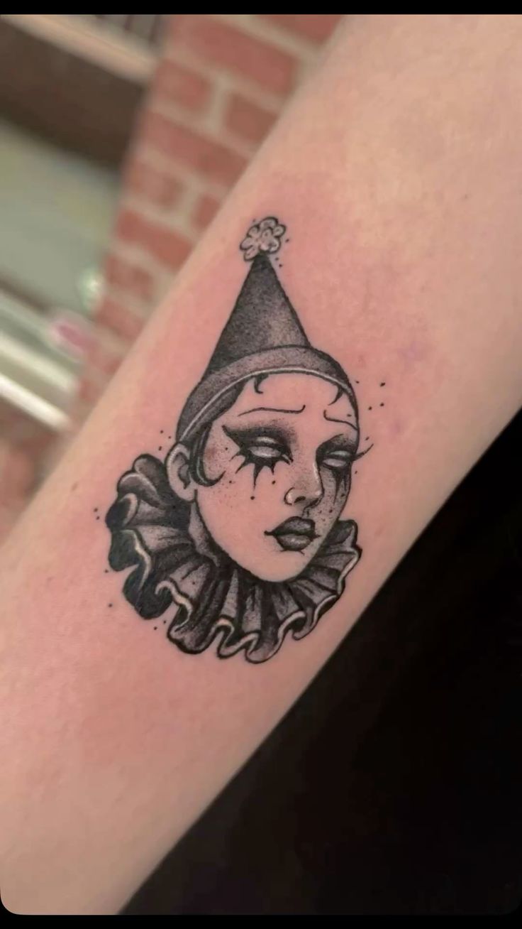 This one is heartbreak in a party hat. The face is delicate, dreamy, and distant, with those heavy dark eyes creating that beautifully smudged, almost sleep-deprived sadness that somehow still looks elegant. More than anything, it feels like a Pierrot moment rather than a circus moment, which makes it softer, moodier, and more fashion-forward. This is exactly the sort of tattoo that catches the eye of someone who loves beauty with a little ache in it. It is feminine without being sweet and dramatic without becoming loud, which is honestly a hard balance to strike.