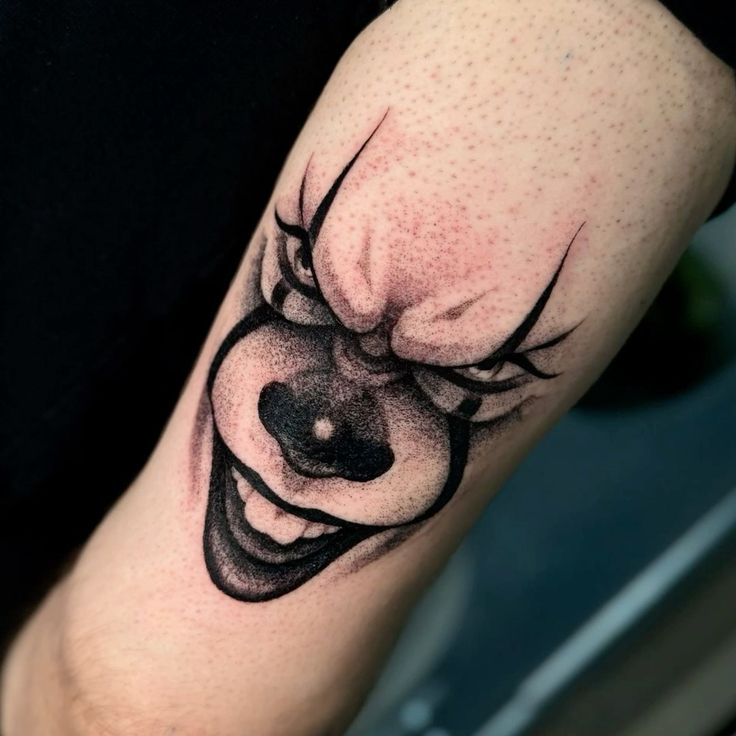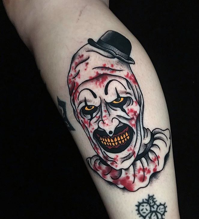 Compared with smoother, cleaner traditional clown tattoos, this design has a rougher edge that makes it feel more modern and more personal. The limited palette keeps it striking without becoming busy, and the medium size makes it easy to place on the arm or calf without losing the facial expression. If you want a tattoo that feels scary but still simple enough to read instantly, this is a strong choice. It is especially good for someone who loves horror imagery but does not want a giant, full-sleeve commitment.