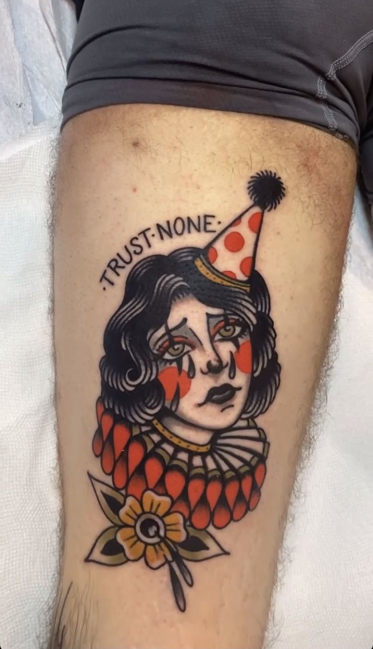 These two clown faces have such a good old-school attitude. One is all wide grins and wild charm; the other looks bored, bitter, and completely over it, which makes them so fun together. There is something instantly lovable about a pair like this because it feels playful without being silly. The bold lines, warm reds, mustard tones, and classic circus styling give the tattoos that unmistakable traditional energy people never seem to get tired of. I love clown tattoo ideas like this because they do not need a complicated concept to work. They are graphic, expressive, and full of personality, which is exactly what makes them memorable.