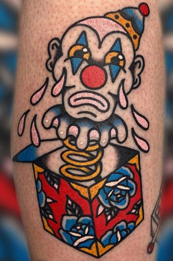 This one has that perfect old-school sadness that somehow makes a tattoo even more lovable. The trembling tears, spring neck, and bright little hat make the clown feel like a classic toy that has seen just a bit too much life. There is real nostalgia here, but it is not sweet in a predictable way. It feels slightly bruised, a little theatrical, and deeply tattoo-ready. If you are drawn to traditional clown tattoo ideas, this is the sort of design that feels timeless because it mixes bold color, clear linework, and emotion in exactly the right proportions.