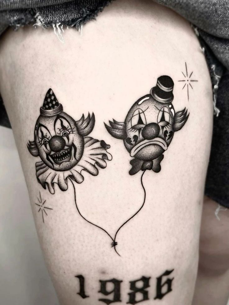 This tattoo has such a good push-and-pull between menace and sadness. One balloon clown grins with sharp, nasty energy, while the other looks droopy, tired, and almost resigned, and that contrast makes the whole piece feel more layered than a typical novelty tattoo. The string joining them together is such a smart touch too. It gives the design a quiet emotional thread, like two sides of the same story floating around together. For anyone hunting clown tattoo ideas with personality, this one feels clever, graphic, and just a little bit haunted.